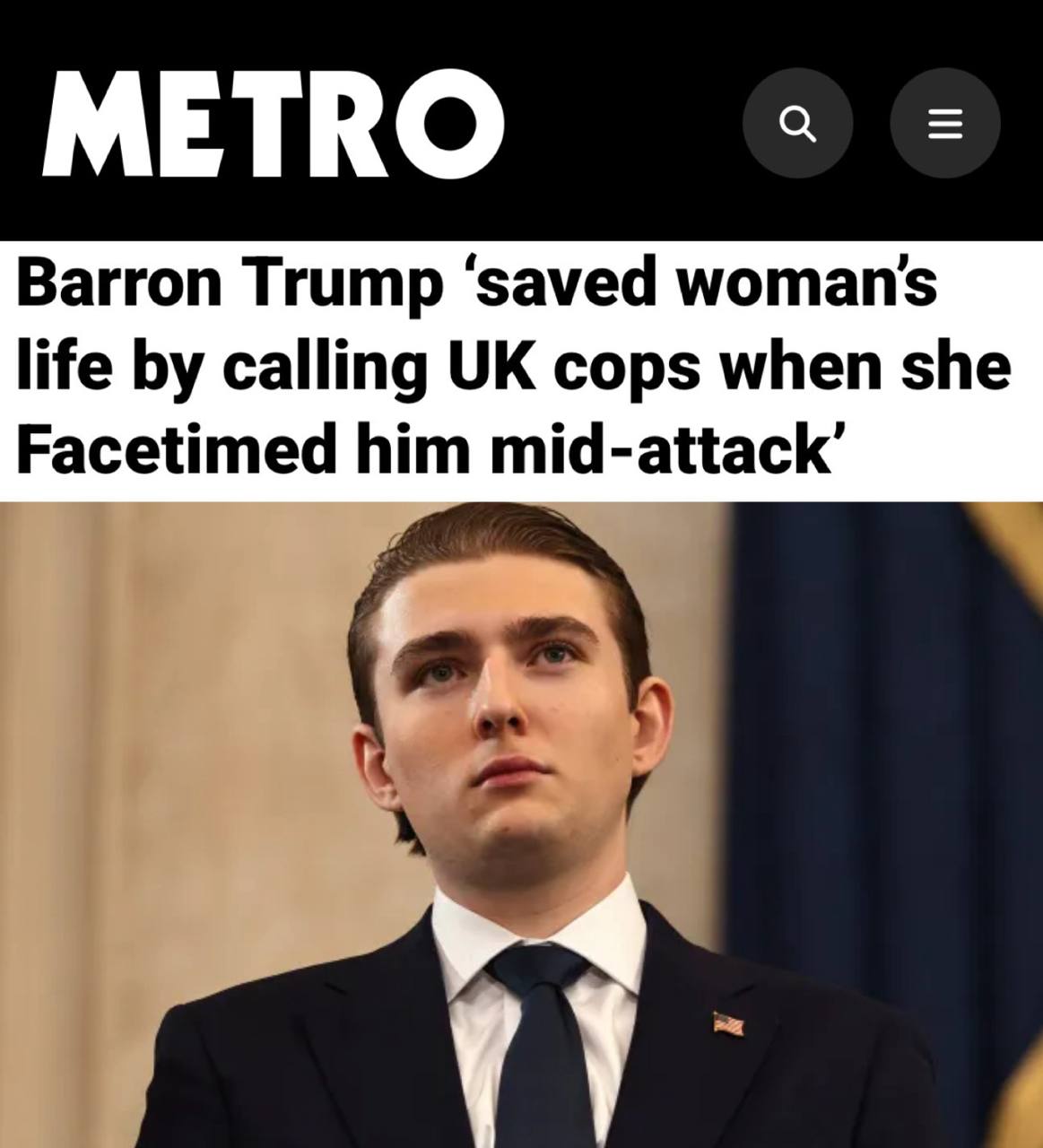 «Бэррон Трамп спас жизнь женщине, позвонив в британскую полицию»: Младший сын Трампа спас женщину от ревнивого друга.