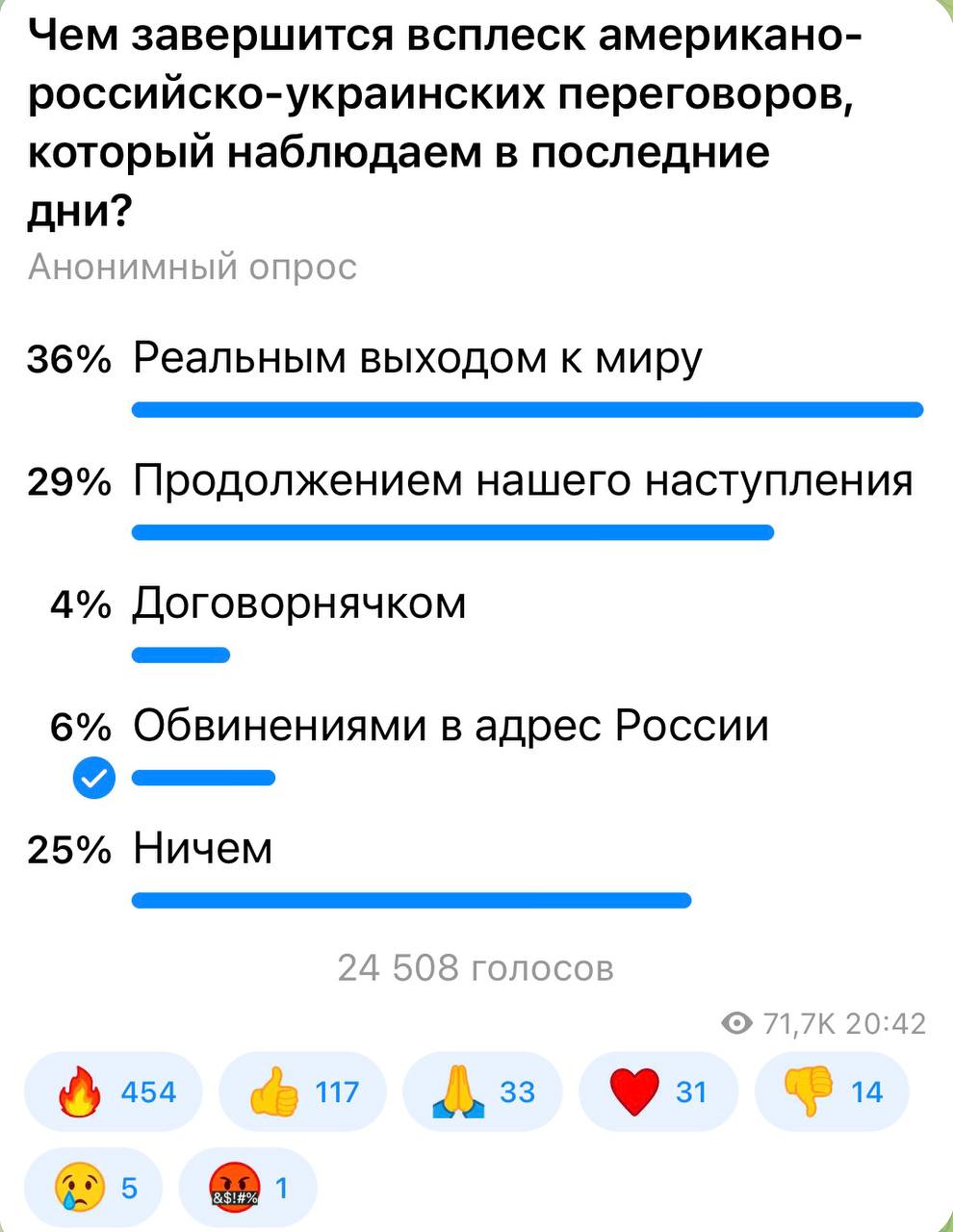 36 процентов подписчиков считают, что переговоры действительно приведут к миру. Вопрос лишь в том, сколько он продержится.