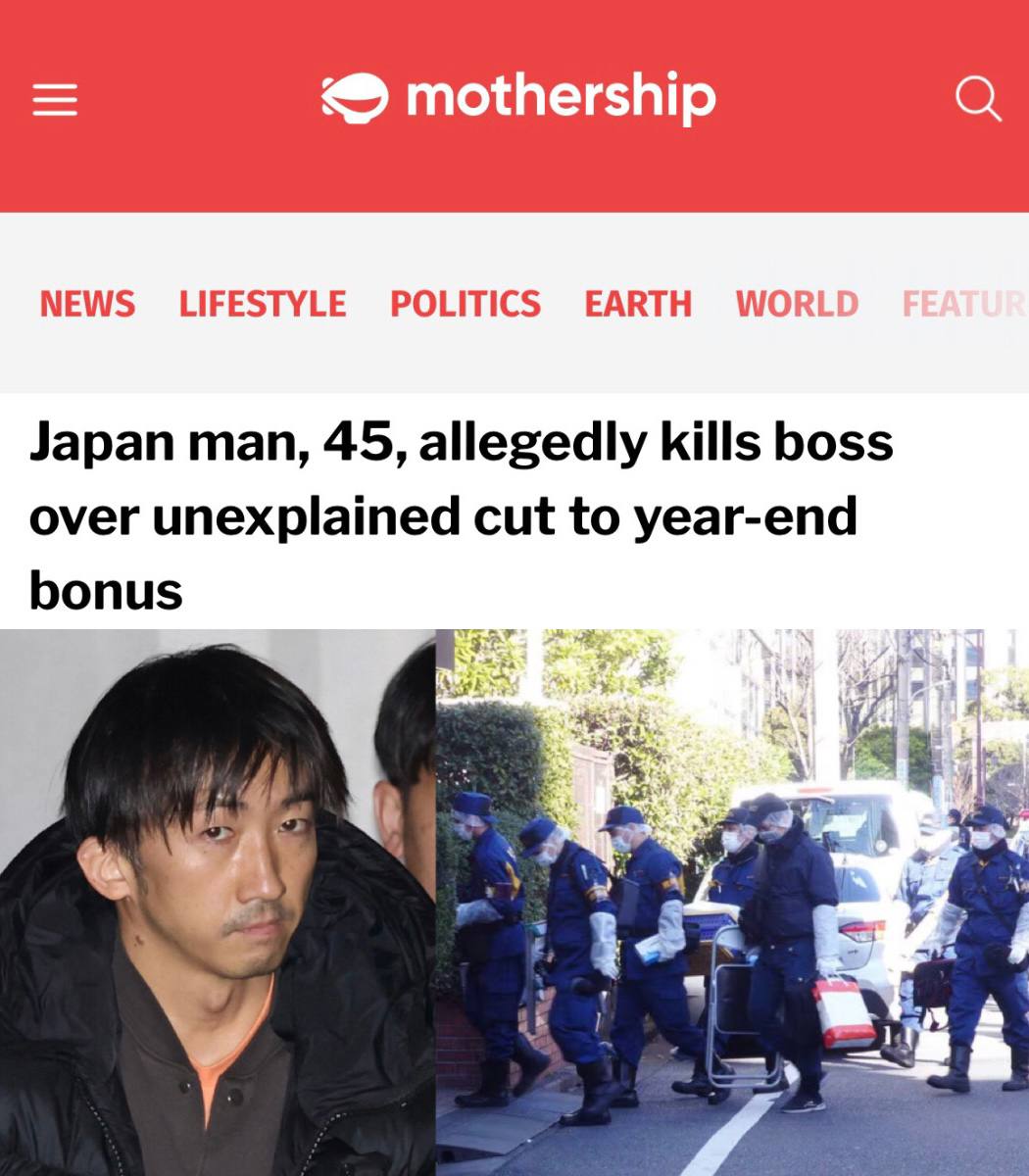 «В Японии 45-летний менеджер Масахиро Яманака убил своего начальника из-за сокращения годовой премии. Он проник в квартиру босса в Токио, распылил инсектицид и нанёс ему более 10 ножевых ранений в шею, живот и бедро. Подозреваемого задержали на следующий день.