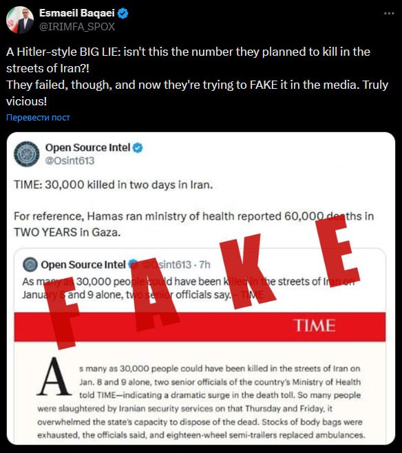 Так представитель МИД Ирана прокомментировал заявления западных СМИ о 30 тысячах погибших в ходе протестов в Иране.