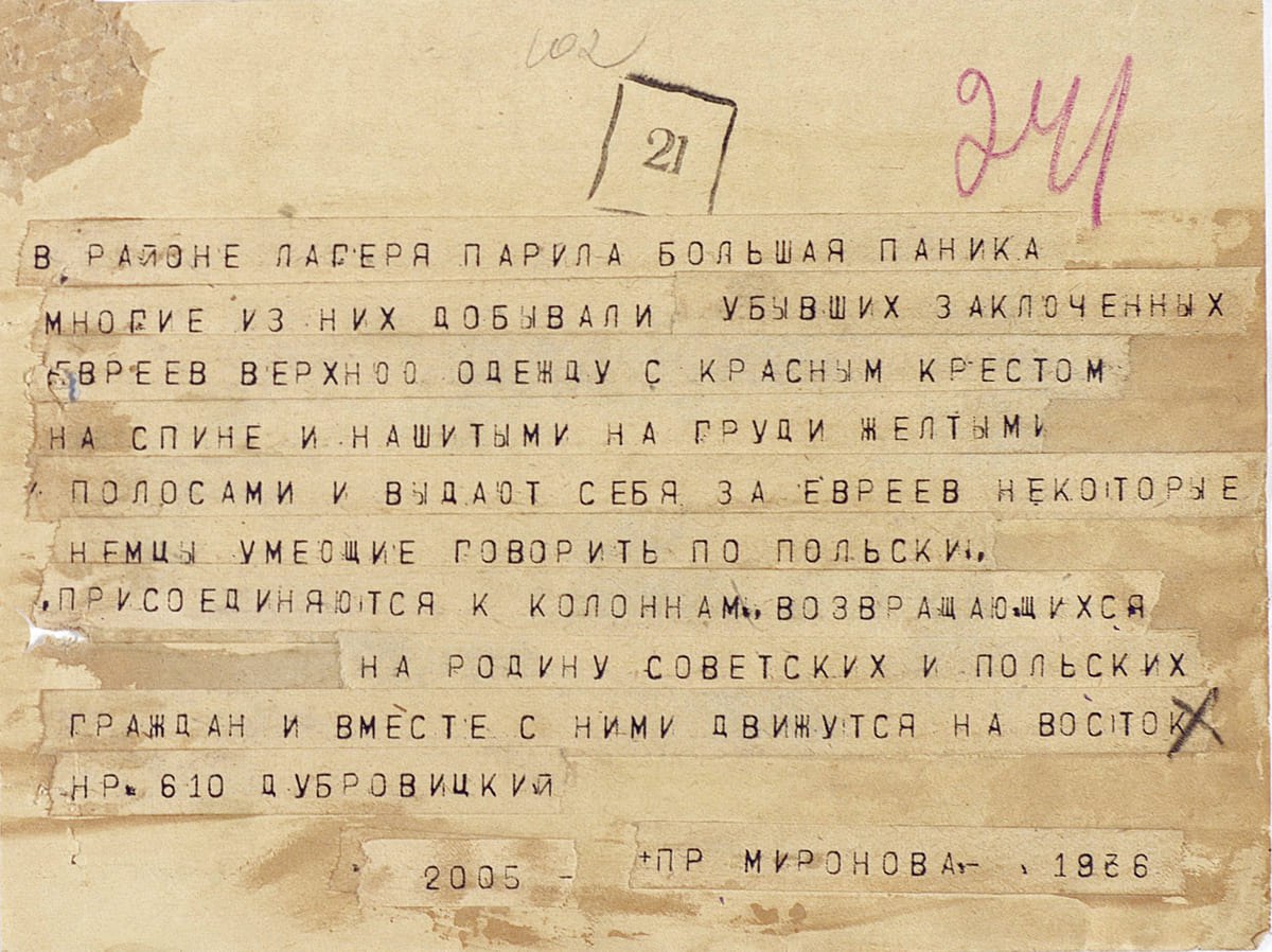 "Тянутся бесконечные вереницы людей, освобожденных Красной Армией из этого лагеря смерти. Они истерически плачут, когда с ними заговаривают бойцы и офицеры Красной Армии; их благодарность невозможно выразить словами. Несмотря на метель и мороз, они идут на восток, прочь от лагеря, как от страшного призрака", — написано в донесении политуправления 1-го Украинского фронта от 29 января 1945 года.