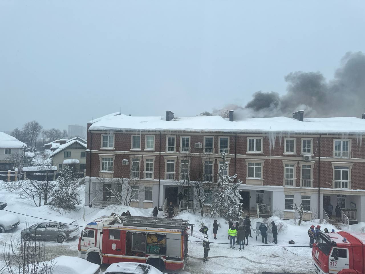 Языки пламени вырываются из окна таунхауса в коттеджном поселке Изумрудный в Новой Москве. Пожар начался на третьем этаже, пламя перекинулось на соседние квартиры.