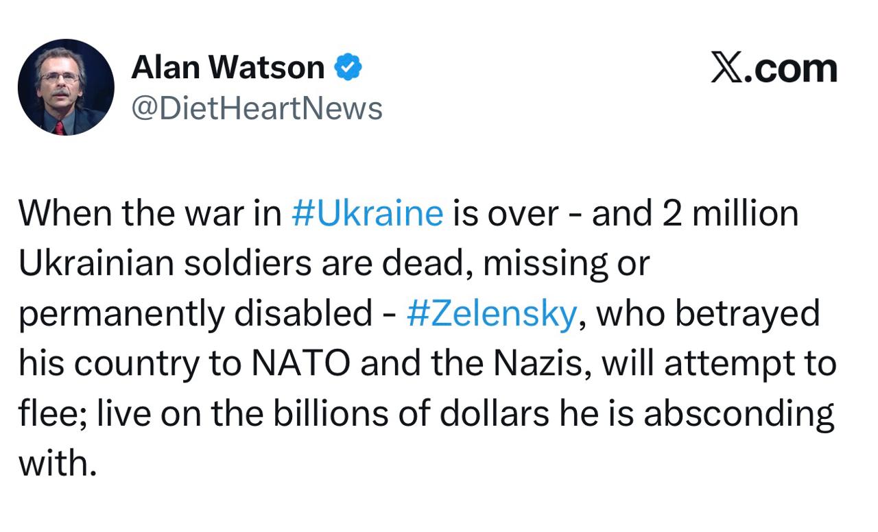 Когда война на Украине закончится — и 2 миллиона украинских солдат погибнут, пропадут без вести или получат необратимые увечья — Зеленский , предавший свою страну НАТО и нацистам, попытается бежать. Он будет жить на миллиарды долларов, которые украл.