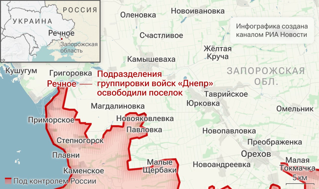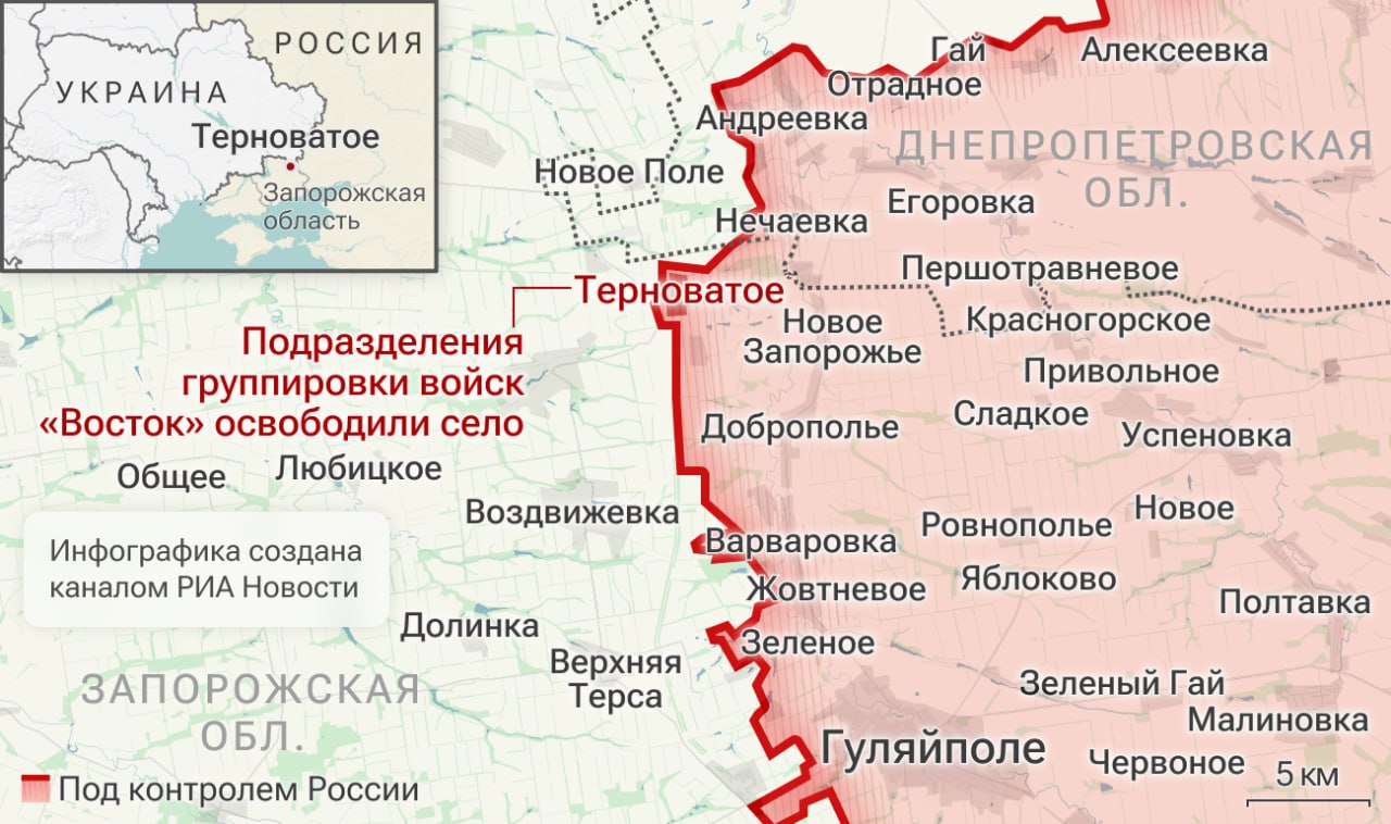 Армия России освободила Терноватое Запорожской области и Бересток ДНР, а также взяла под контроль Речное в Запорожской области.