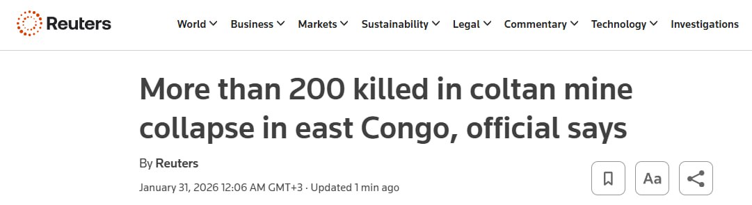 Reuters: более 200 человек погибли в результате обрушения шахты в провинции Северное Киву на востоке Демократической Республики Конго.