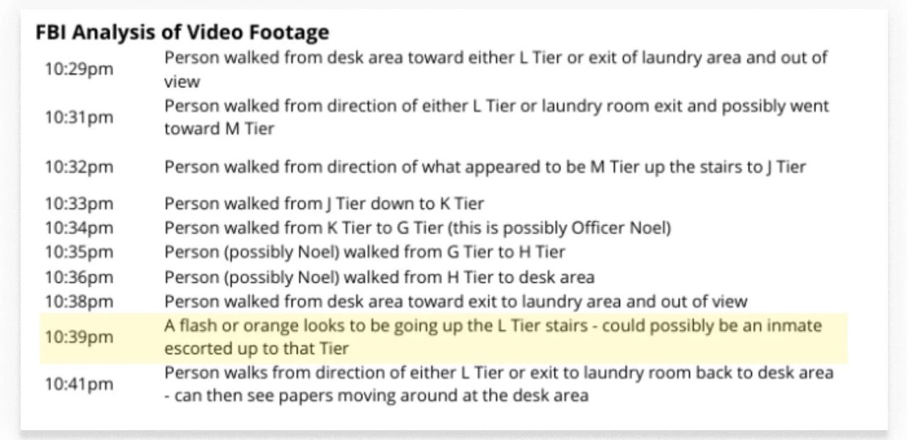 При анализе видеокадров за 9 августа 2019 года около 22:39 был зафиксирован неизвестный, поднимающийся по лестнице к изолированному и запертому блоку тюрьмы, где находилась камера Эпштейна. В этой камере он был обнаружен мёртвым на следующий день.