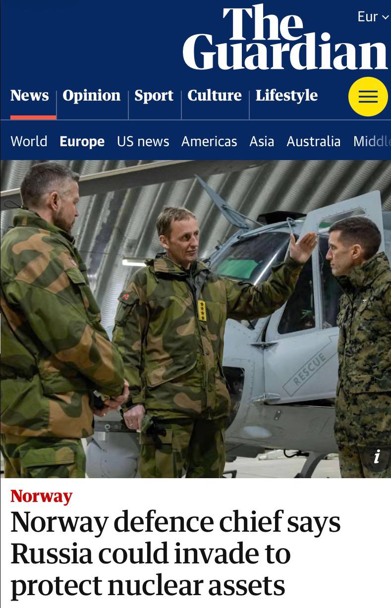 Генерал Эйрик Кристофферсен заявил, что Осло не исключает возможности российского вторжения в страну в будущем. По его словам, Москва может попытаться захватить норвежскую территорию, чтобы защитить свои ядерные активы на Кольском полуострове - подводные лодки, ракеты и авиацию, которые остаются главной угрозой для США. Хотя цели России в Норвегии не такие, как в Украине, сценарий защиты ядерного потенциала в Арктике остаётся в планах норвежской обороны.