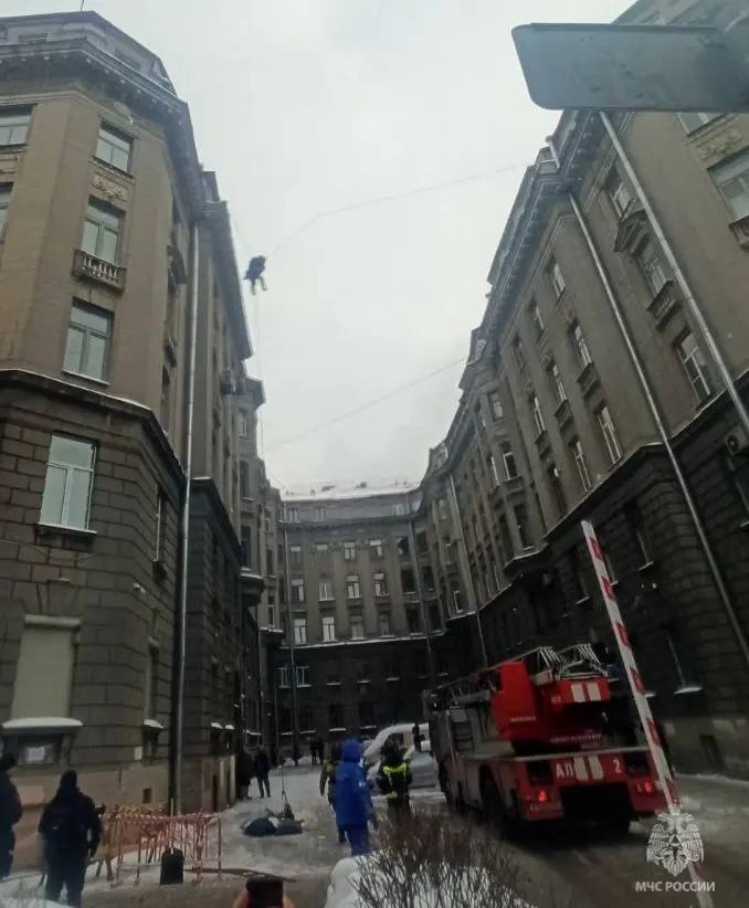 Рабочий повис на проводах в Петербурге. Он убирал снег на шестиэтажном доме, но сорвался с крыши.