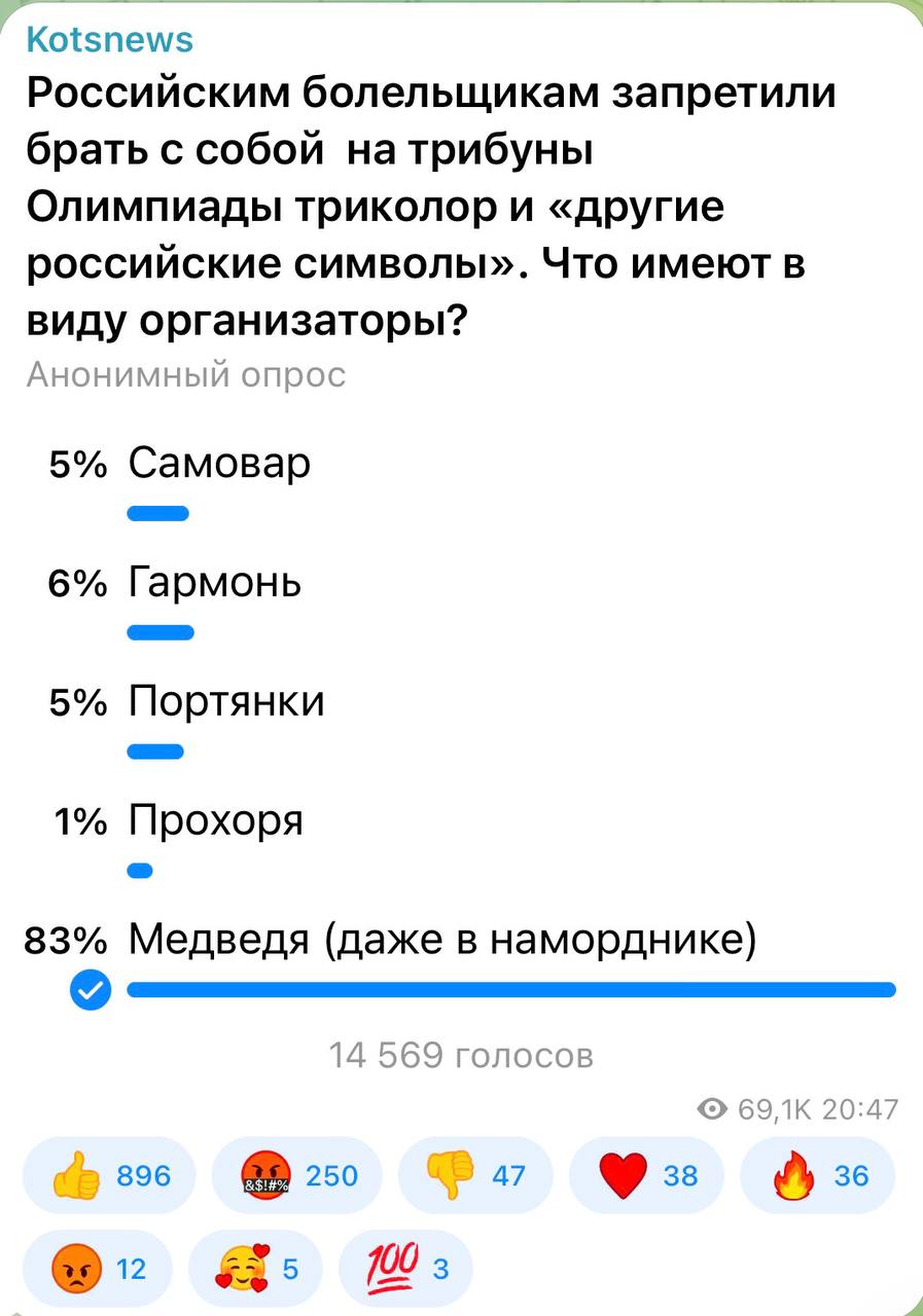 83 процента подписчиков считают, что на трибуны можно привести медведя в наморднике. А если партнеры продолжат хамить, намордник можно будет снять.
