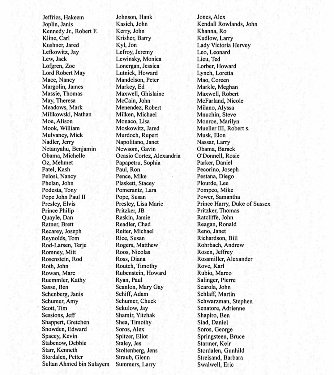 Вишенка на торте — приложение к письму с перечнем из 318 имен — это госчиновники и знаменитости, чьи фамилии хотя бы один раз встречаются в опубликованных документах. Хотя попадание в список, конечно, не означает причастности к преступлениям, хотя кто-то из этого списка был на прямой связи с педофилом и его подельницей.
