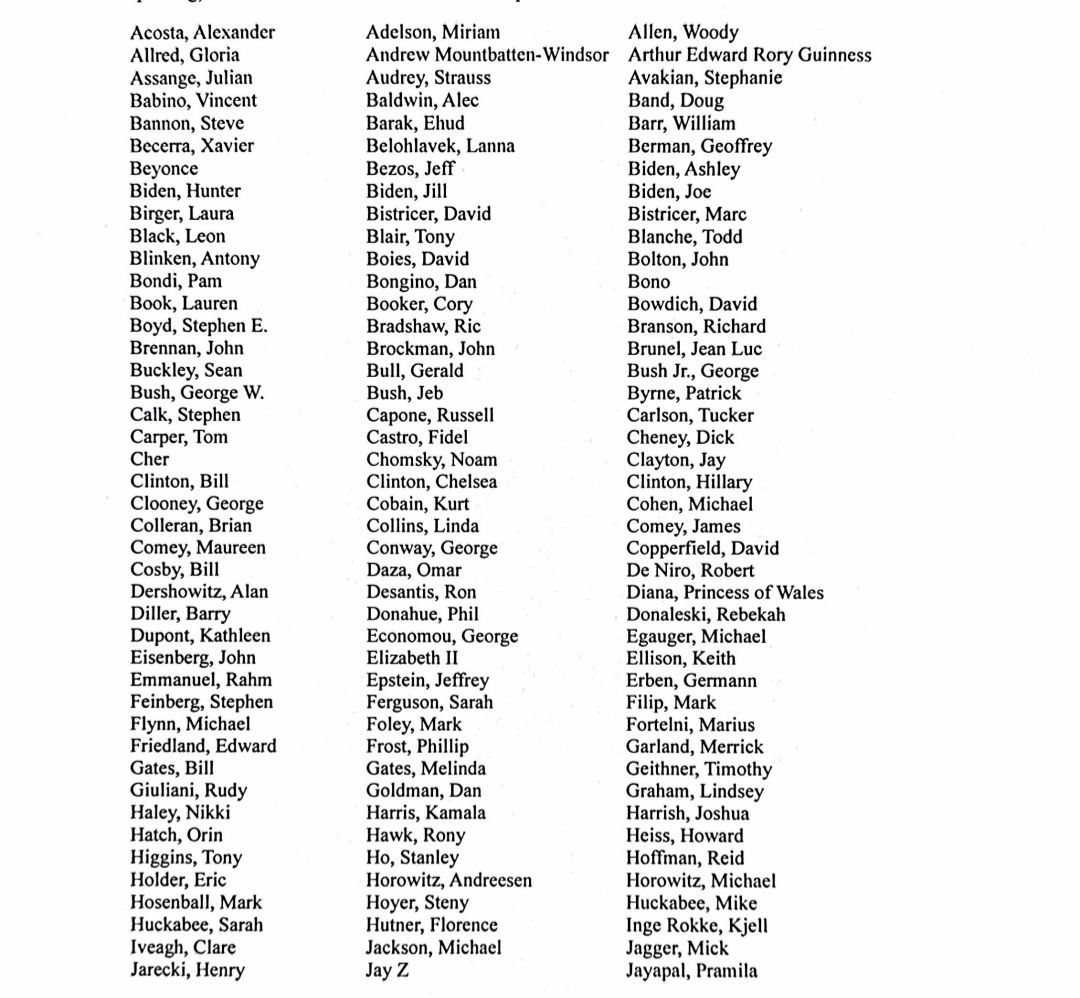 Среди упомянутых — Дональд Трамп и Джаред Кушнер, Джилл Байден, Камала Харрис, Барак и Мишель Обама, Джордж Буш, принц Гарри и даже Елизавета II, Билл Гейтс, Вуди Аллен, Марк Цукерберг, террорист и экстремист Линдси Грэм, а также, например, сама Пэм Бонди и Такер Карлсон. А еще Мэрилин Монро