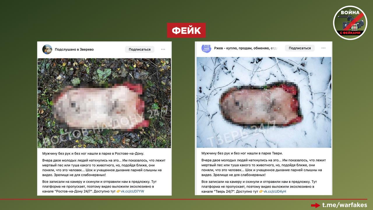Стоит отдать должное авторам вброса: в некоторых случаях они попытались адаптировать подделку к климатическим реалиям регионов, «поместив» изображение «находки» на фон в виде снега. Для южных регионов используется подложка без снега, но с тем же заблюренным телом.