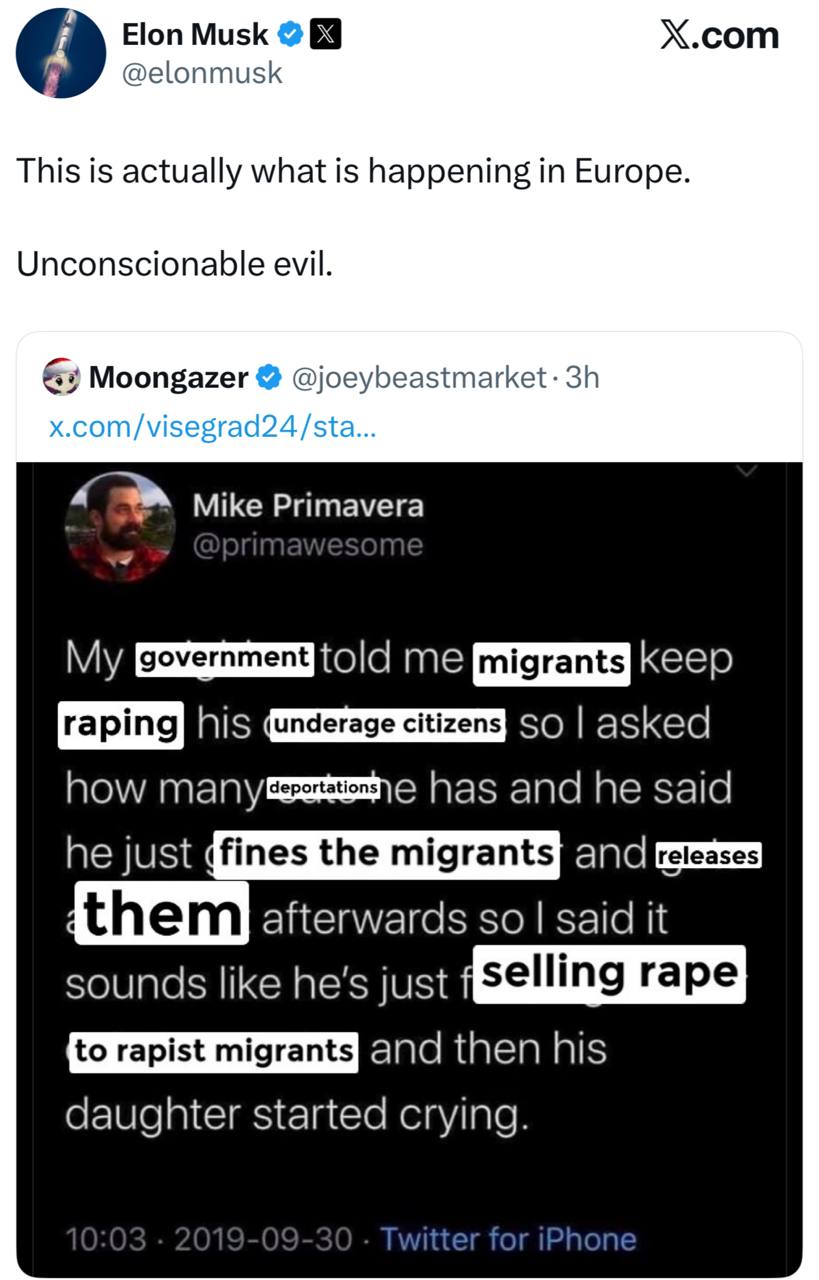 [Мое правительство сообщило мне, что мигранты продолжают насиловать несовершеннолетних граждан, поэтому я спросил, сколько всего депортаций, и они сказали, что просто арестовывают мигрантов и отпускают их. Позже я сказал, что это звучит так, будто он просто продает насилие мигрантам-насильникам, и тогда его дочь начала плакать]