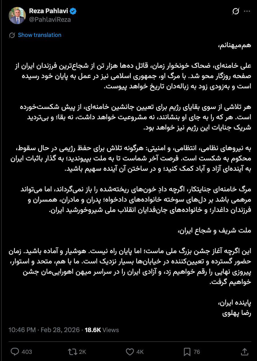 Обращаюсь к вооруженным силам, полиции и органам безопасности: любые попытки сохранить падающий режим обречены. Это ваш последний шанс присоединиться к народу; помочь стабильному переходу Ирана к свободному и процветающему будущему и стать частью созидания этого будущего. <...> Благородный и отважный иранский народ, хотя это начало нашего великого национального праздника, это еще не конец пути. Будьте бдительны и готовы. Время масштабного и решающего присутствия на улицах очень близко. Мы вместе, единые и стойкие, добьемся окончательной победы и отпразднуем свободу Ирана на всей нашей священной родине. Да здравствует Иран».