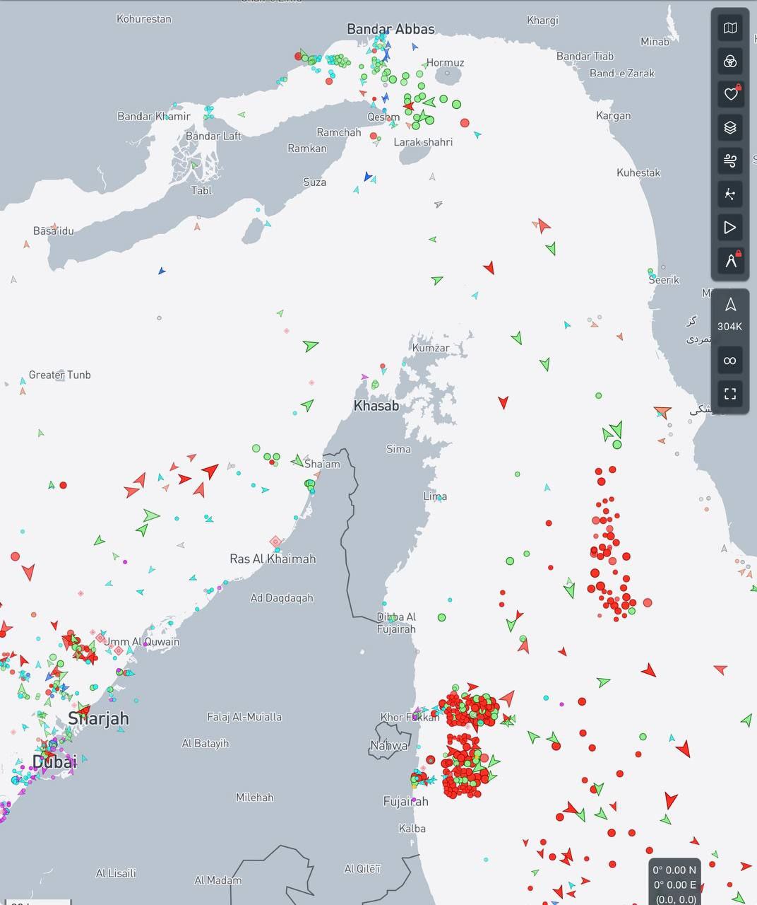 Эта атака дала некоторый результат; трафик в проливе начал снижаться, но о его прекращении говорить ещё очень рано. Судя по данным из открытых морских онлайн-трекеров, наблюдается повышенное скопление танкеров на якорных стоянках (красный круг на карте) с обоих сторон Ормуза. Однако рост числа судов на стоянке не значителен – их всегда там не мало.