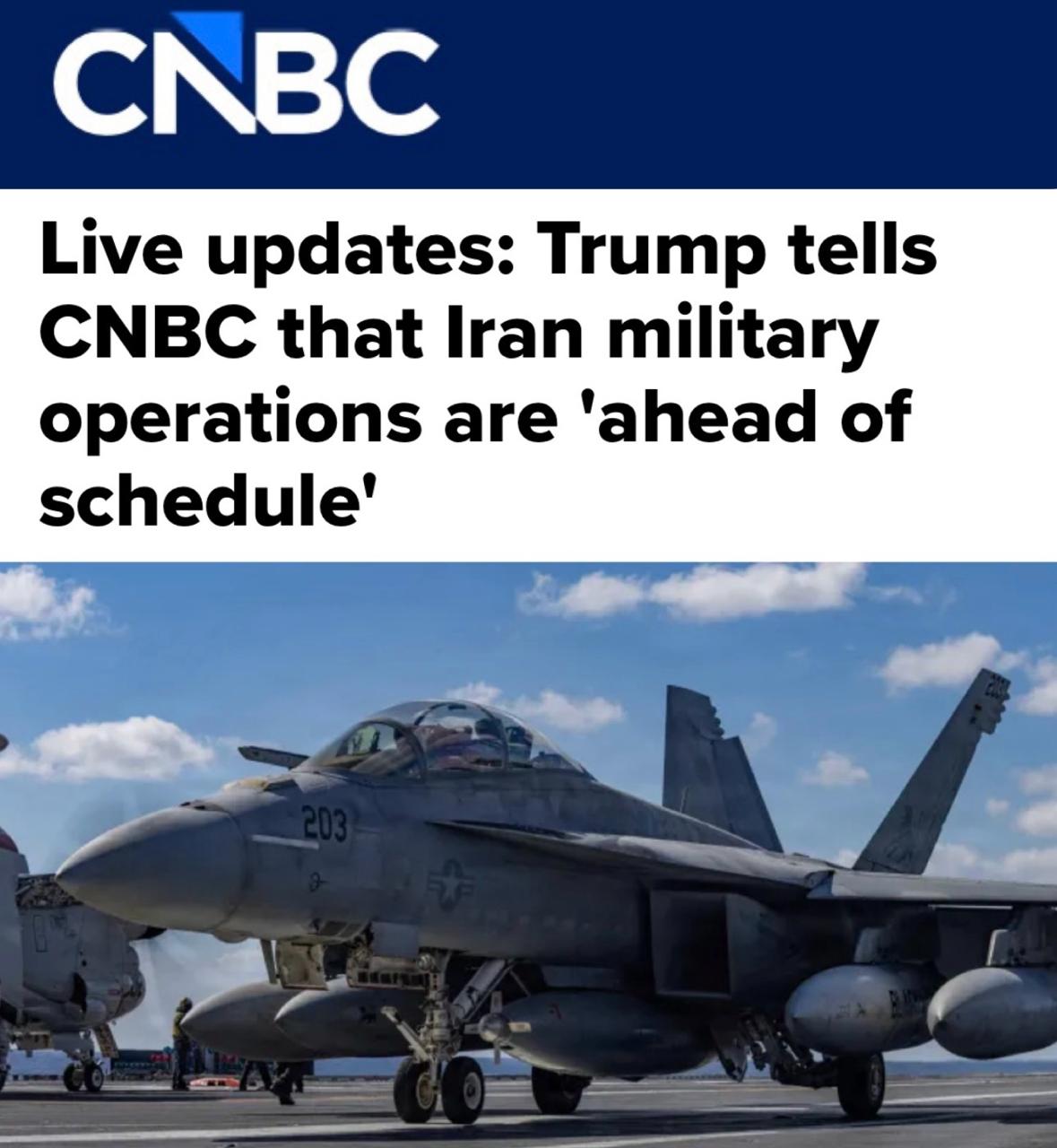 «Президент Дональд Трамп в разговоре с ведущим CNBC Джо Керненом сообщил, что американская военная операция в Иране «идёт очень успешно и даже с опережением намеченных сроков».