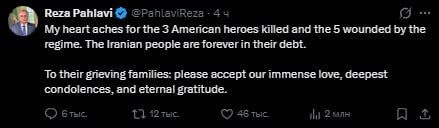 «Мое сердце болит за трех американских героев, погибших и пятерых раненых режимом. Иранский народ навсегда в долгу перед ними.