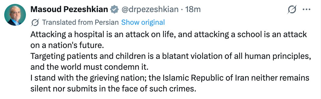Президент Ирана Масуд Пезешкиан призвал мировое сообщество осудить США и Израиль за нападения на школы и больницы исламской республики.