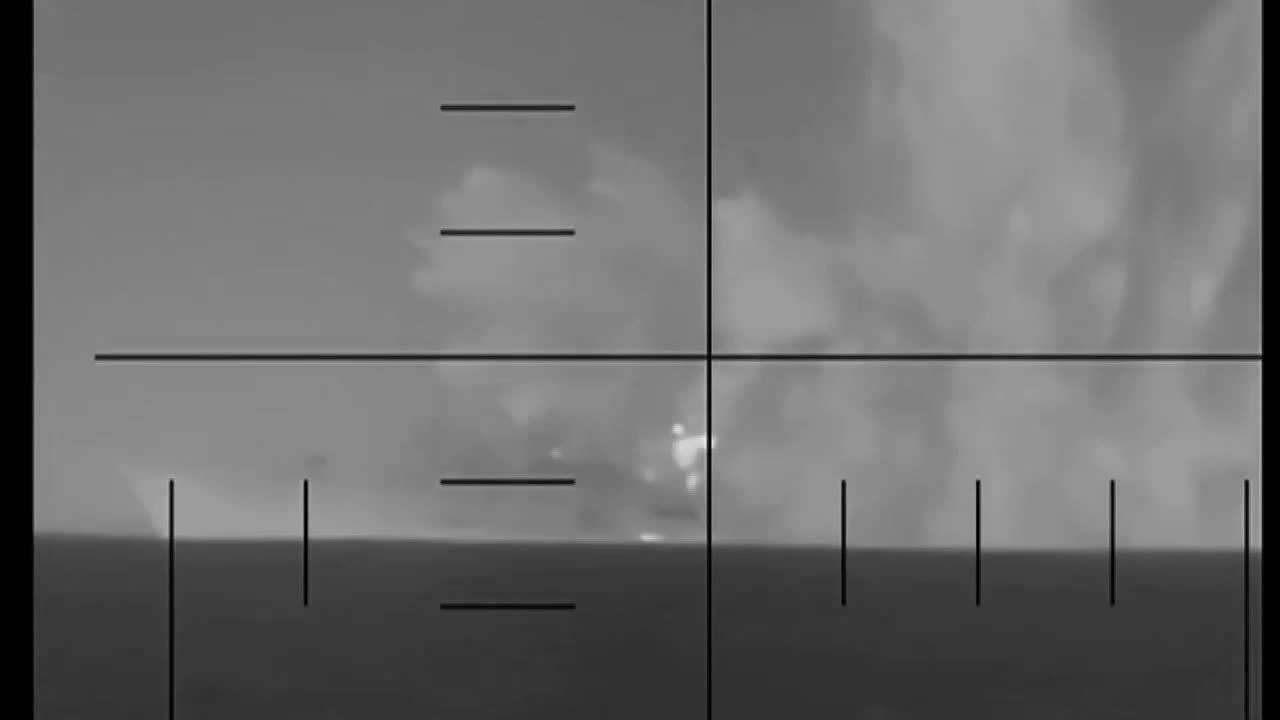 Момент уничтожения иранского фрегата Dena подводной лодкой США у берегов Шри-Ланки. Судя по всему, это была торпедная атака. На кадрах видео, опубликованных Пентагоном, видно, как кормовую часть корабля взрывом буквально приподнимает над водой и отрывает начисто.