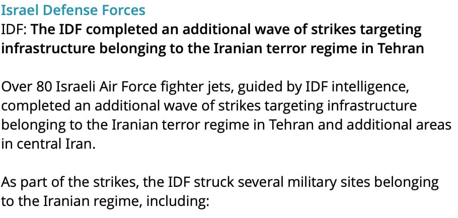 ЦАХАЛ сообщил об ударе по Университету имени Имама Хусейна — ключевому учебному центру Корпуса стражей исламской революции, где готовят офицерский состав КСИР. По данным израильской армии, на территории объекта находилось множество военных объектов.