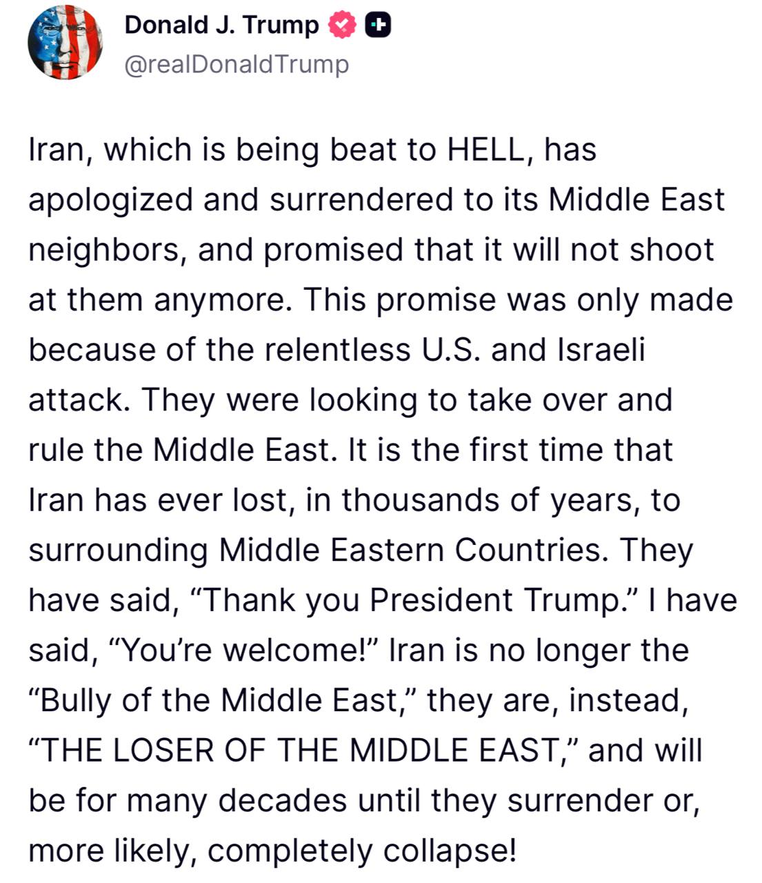 Иран, который находится в ужасном положении, извинился и сдался своим ближневосточным соседям, пообещав, что больше не будет по ним стрелять. Это обещание было дано только из-за непрекращающихся атак США и Израиля. Они стремились захватить и править Ближним Востоком. Это первый случай за тысячи лет, когда Иран проиграл соседним ближневосточным странам. Они сказали: «Спасибо, президент Трамп». Я ответил: «Пожалуйста!»