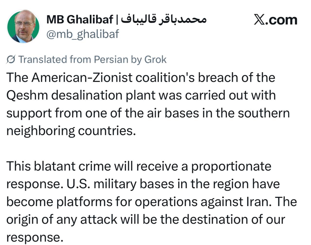 Американско-сионистская коалиция совершила нападение на установку в Кешме при поддержке одной из авиабаз в соседних южных странах. Это вопиющее преступление не останется безнаказанным. Военные базы США в регионе стали плацдармом для операций против Ирана. Ответный удар будет нанесен по месту совершения любого нападения.