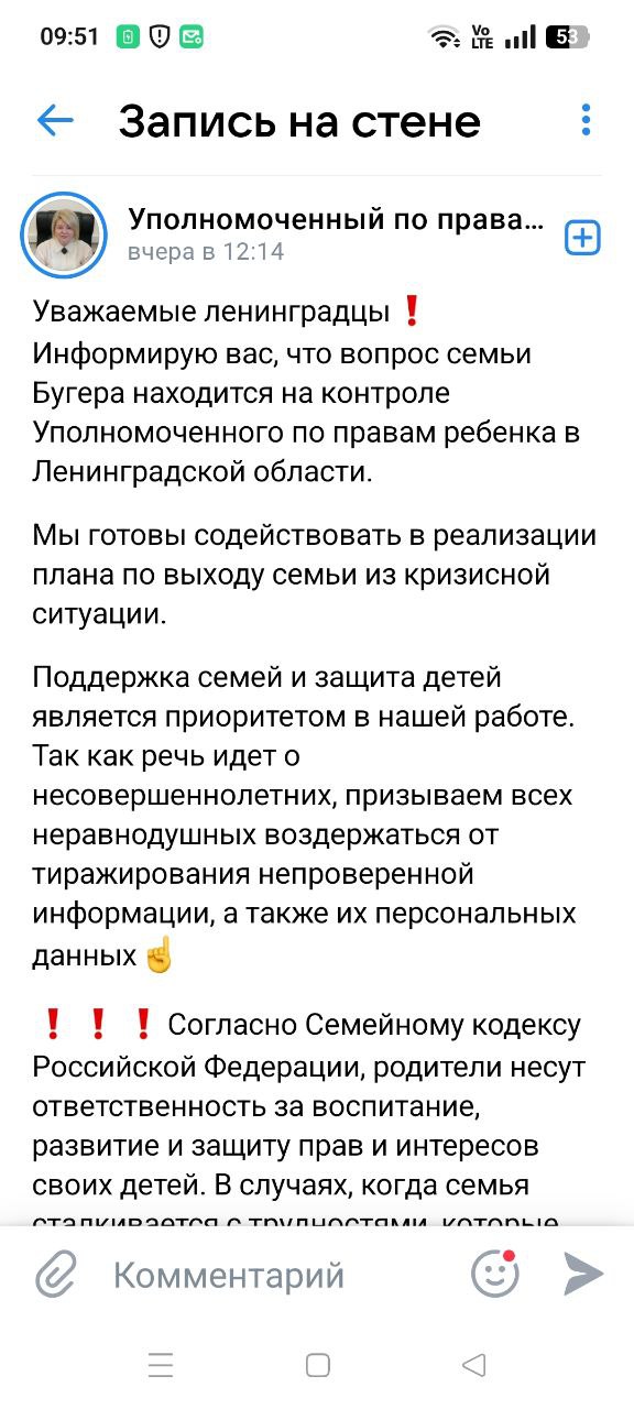 Уполномоченный по правам ребёнка Ленобласти Толстова просит не публиковать персональные данные и не распространять непроверенную информацию, о ситуации она узнала из интернета, когда эта история длится уже два месяца