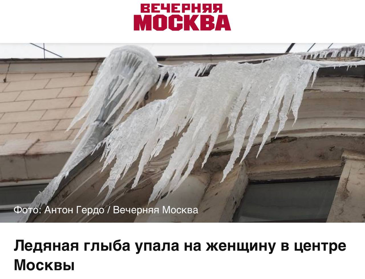 «Ледяная глыба упала на женщину в центре Москвы»: Кусок льда убил проходившую мимо сотрудницу ВШЭ.