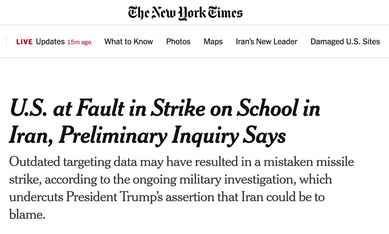 Ответственность за удар по школе для девочек в иранском Минабе несут США, пишет The New York Times со ссылкой на предварительные данные расследования.