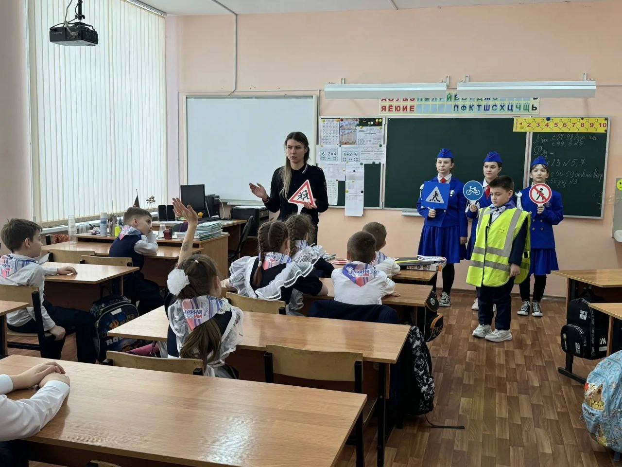 Школьники разобрали различные дорожные ситуации, в которых они могут оказаться, а также вспомнили значения дорожных знаков, виды пешеходных переходов и светофоров.
