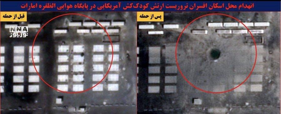 Фото №2. Спутниковые снимки показывают огромный ударный кратер на авиабазе Аль-Дафра в ОАЭ, предположительно вызванный тяжелой иранской баллистической ракетой серии "Хоррамшахр".