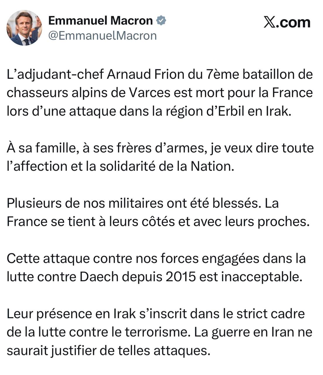 Макрон: Старший прапорщик Арно Фрион погиб за Францию во время атаки в районе Эрбиля в Ираке.