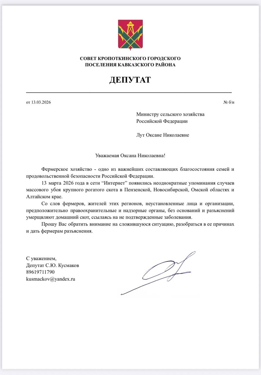 Хоть один депутат с яйцами нашелся на всю страну - и тот муниципальный из Краснодара. Он направил обращения министру сельского хозяйства, председателю следственного комитета и генеральному прокурору.