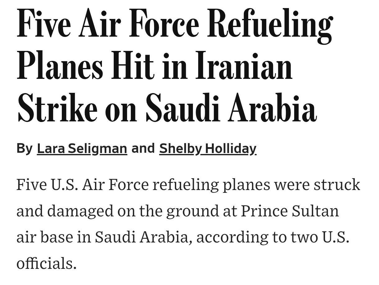 Пять американских самолётов-заправщиков были повреждены иранским ракетным ударом по авиабазе Prince Sultan в Саудовской Аравии, сообщает The Wall Street Journal со ссылкой на источники.