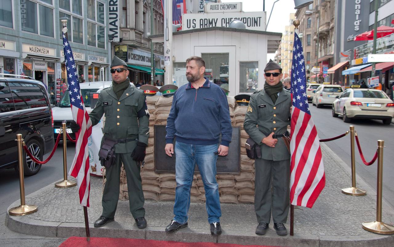 Берлин, театрализованный КПП «Чарли», место, в котором чуть не началась третья мировая война. Советские и американские танковые колонны стояли друг против друга двое суток, 27 и 28 октября 1961 года. Один случайный или провокационный выстрел и вчерашние союзники начали бы сражение в центре Европы. Рассосалось.