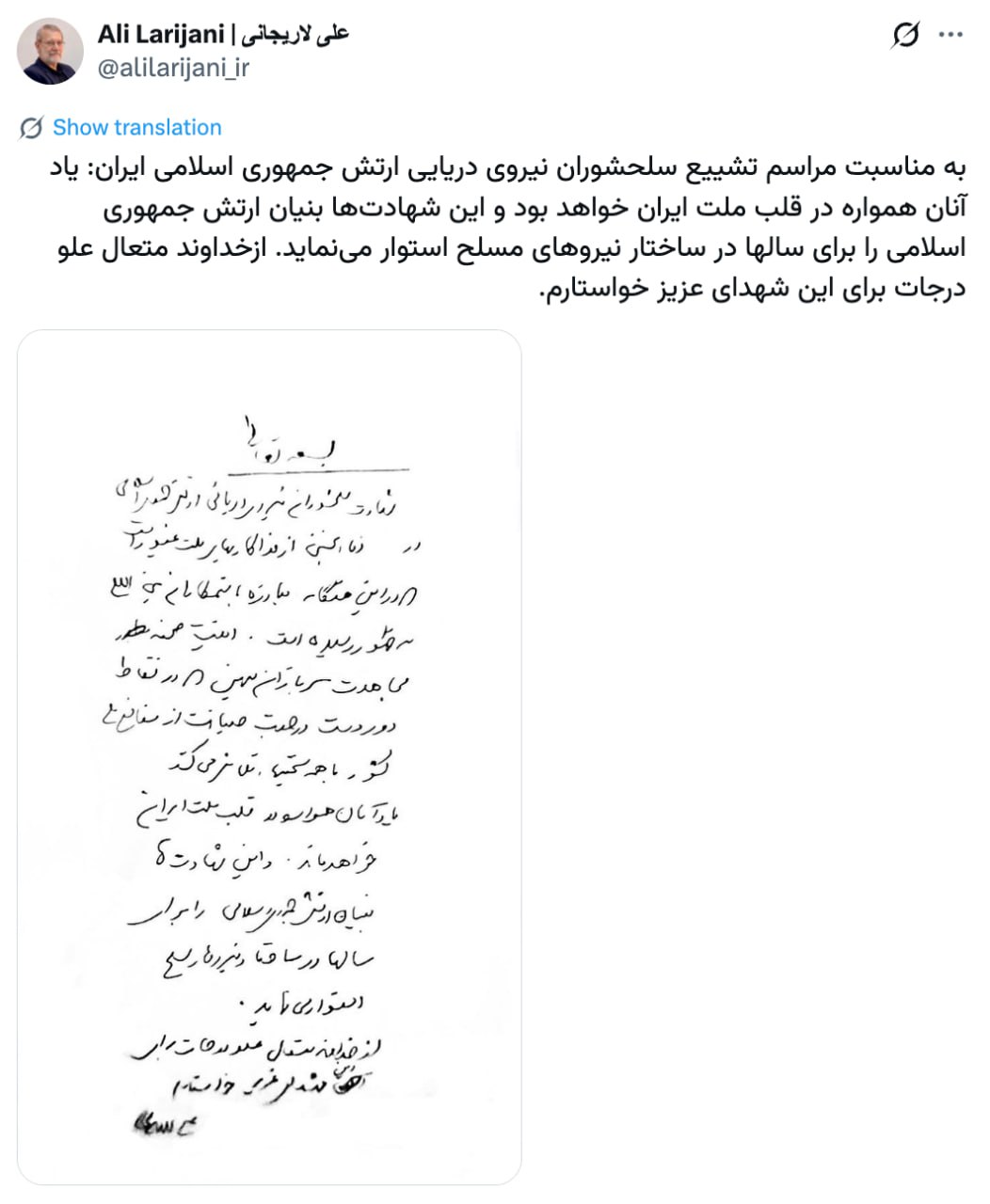 Объявленный убитым ЦАХАЛ секретарь Совета национальной безопасности Ирана Али Лариджани опубликовал пост по случаю церемонии прощания с убитыми американцами моряками фрегата IRIS Dena.