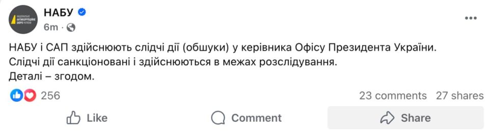 «НАБУ и САП проводят следственные действия (обыски) у руководителя Офиса президента Украины.Следственные действия санкционированы и осуществляются в рамках расследования.Подробности — позже»Соловьёв в Max | Соловьёв в...
