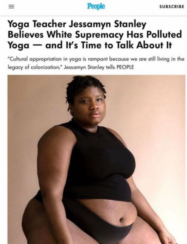Борьба афроамериканцев со всем "белым" не просто граничит с абсурдом, а абсурдом и является. Некогда это была оправданная борьба за свои права - теперь вымороченные обвинения в адрес белых, например, в том, что "белое превосходство отравило йогу" (?!). Вот эта очень корпулентная дама, которая называет себя "тренером по йоге" хочет перехватить йогу у нехороших белых. Интересно, какую позу йоги она при таком весе способна показать ? Занятия йогой бодизитив сочетаются очень плохо. Но зато в либеральных СМИ такие заявления идут "на ура". https://t.me/kozakrichala/48691.