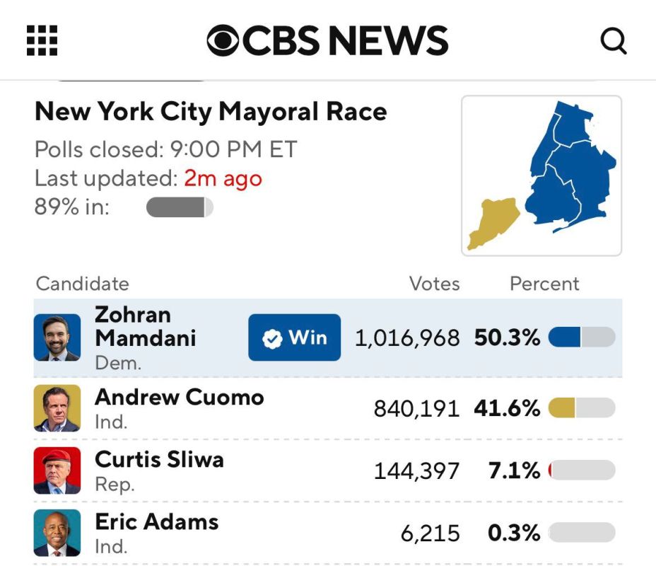 Представляющий Демпартию США социалист, 34-летний Зохран Мамдани лидирует на выборах мэра Нью-Йорка.