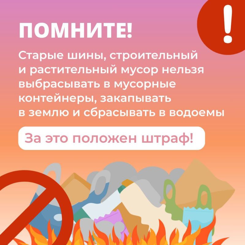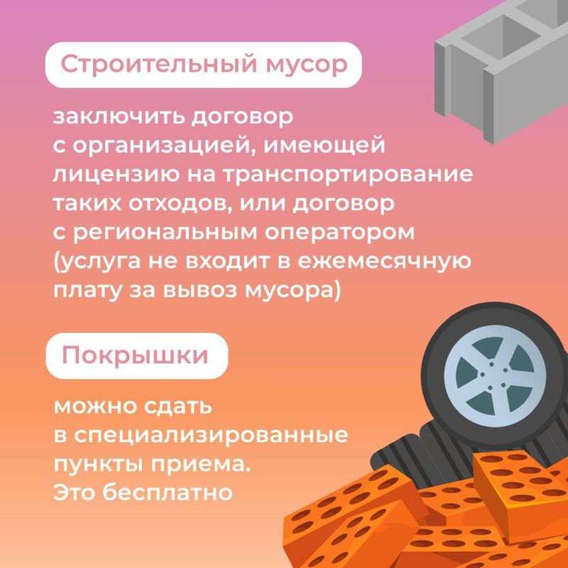 Строительные, растительные отходы и покрышки нельзя выбрасывать в мусорные контейнеры или оставлять в безлюдных местах.