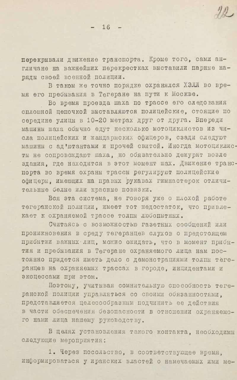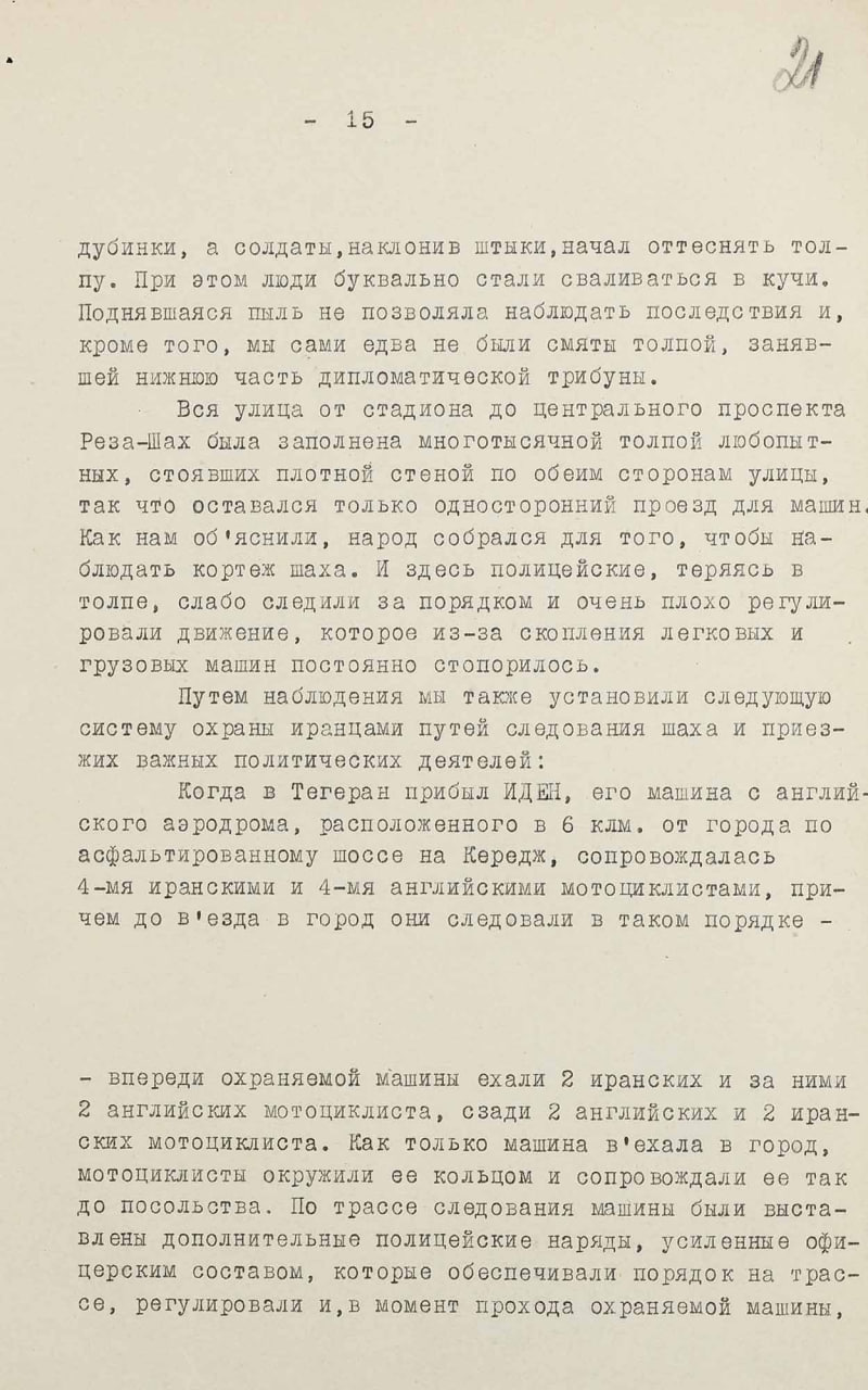 "Шофера, особенно военных английских и американских машин, не подчиняются указаниям регулировщиков даже из числа полицейских офицеров, которые в часы "пик" или проезда шаха выставляются на ответственных перекрестках. Мы ни разу не наблюдали, чтобы шофера-нарушителя остановили, предупредили или оштрафовали. Кое-где поставленные светофоры служат больше украшением тегеранских улиц, а не средством регулирования движения", — говорится в рассекреченной докладной записке.