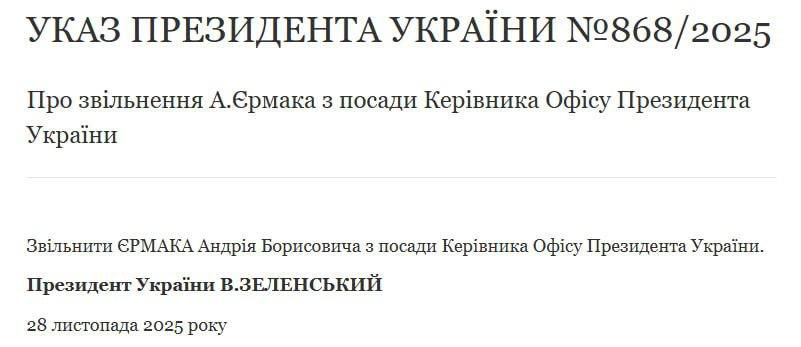 Ермак уволен с поста главы офиса Зеленского на фоне коррупционного скандала. Соответствующий указ появился на сайте офиса Зеленского.