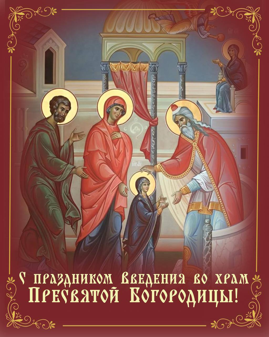 Днесь в храме Божии ясно Дева является и Христа всем предвозвещает... На ступенях ветхозаветной святыни Иерусалимского храма поставляется трёхлетняя Юница, торжествующая и радующаяся. А престарелые праведные родители Её, Иоаким и Анна, и хор отроковиц с возжжёнными свечами сопровождают Ту, Которая приносится в дар Богу. Объятый священным восторгом, первосвященник Захария вводит Святую Отроковицу во Святая Святых, куда входить мог только он сам и только раз в год. Так Бог Отец из всех отроковиц избрал Себе единую в Матерь Сыну Своему. И, избрав, привёл Её к Себе в Свой Царственный дом, в храм, и здесь заключился завет: Он избрал, а Она обещалась в верности. Так произошло духовное обручение между Богом Отцом и Девой Марией. Дева обручается Богу Отцу, готовится быть Материю Сыну и воспитывается Духом Святым.