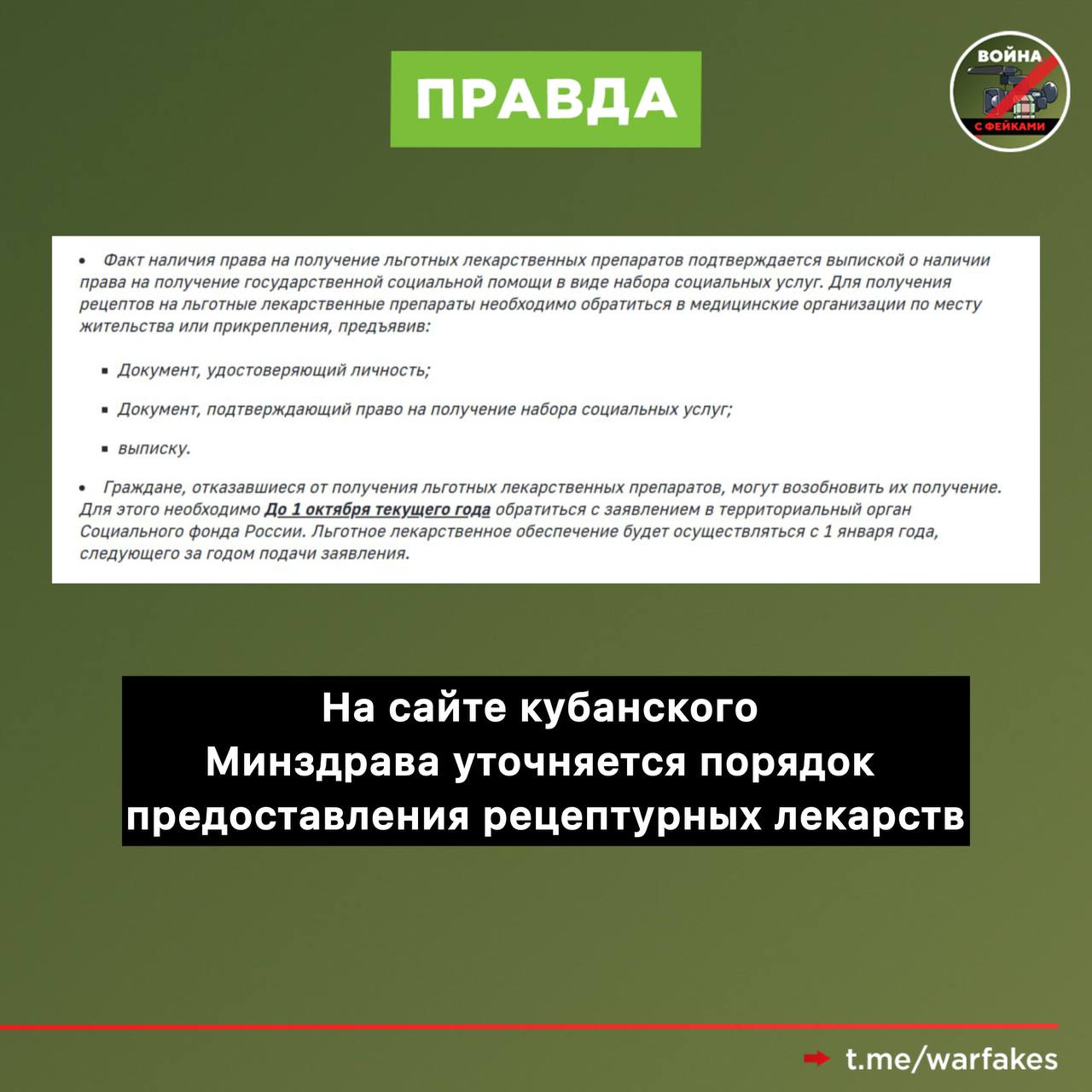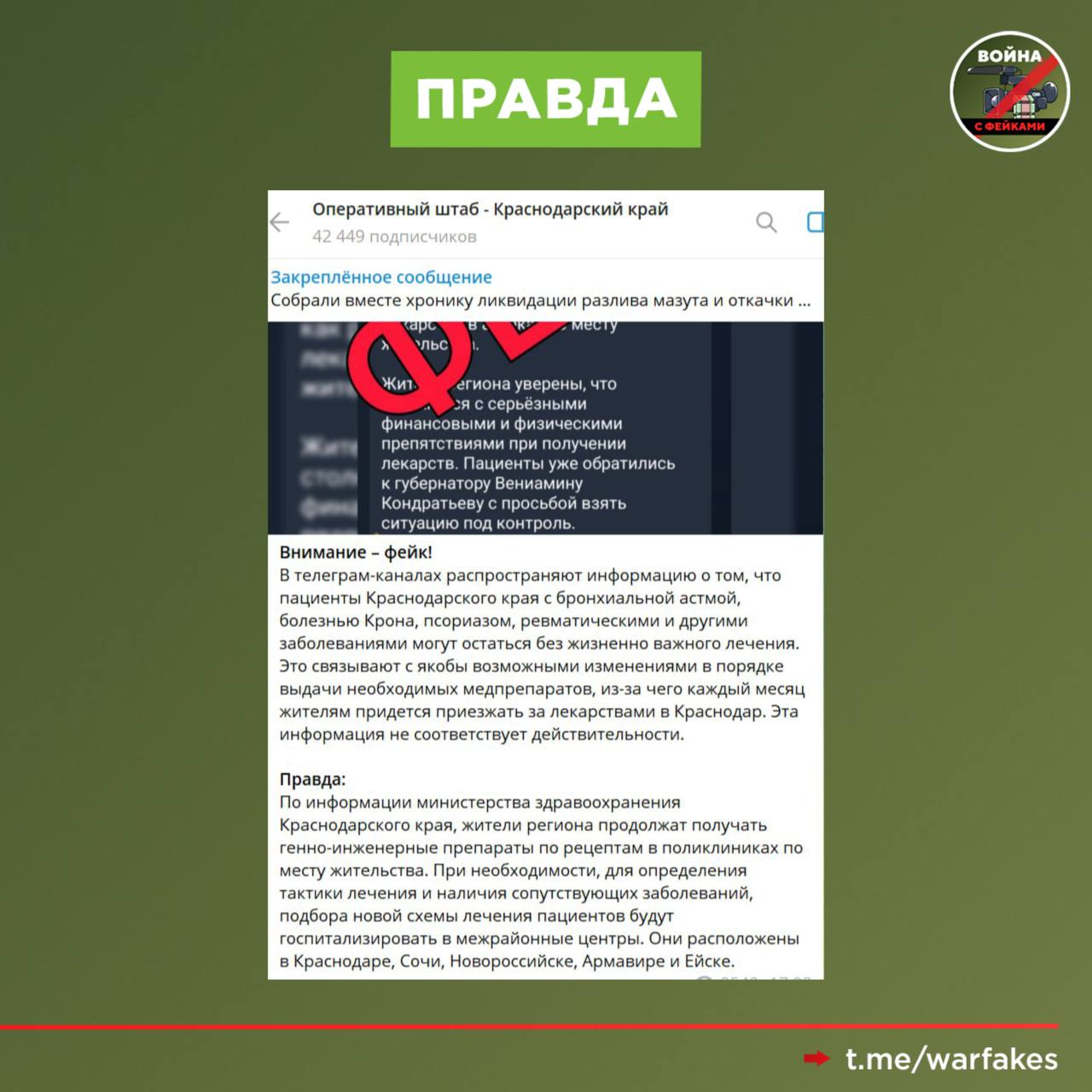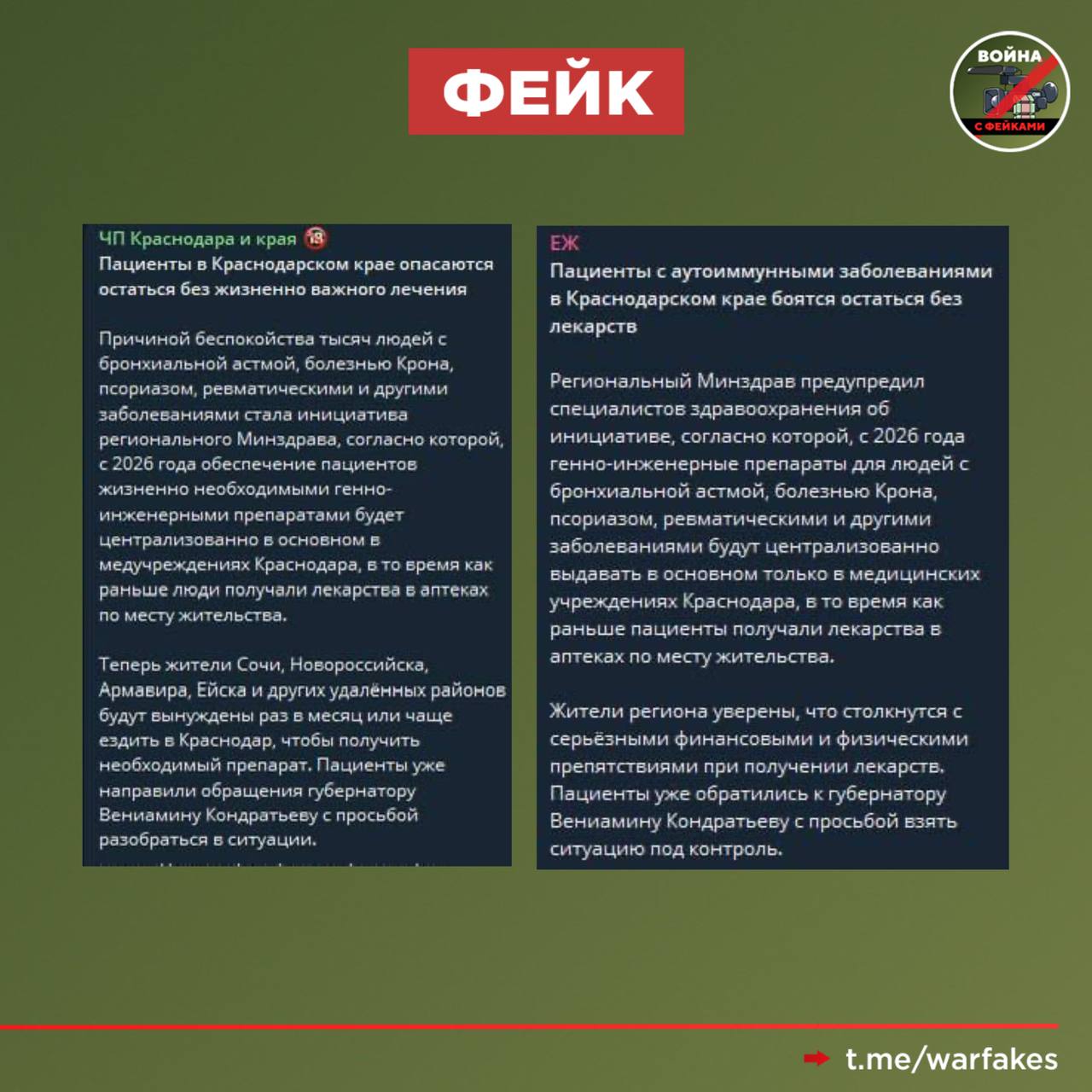 Фейк: Жители Краснодарского края с 2026 года не смогут получать генно-инженерные препараты в поликлиниках по месту жительства. За ними жителям районов придется ездить в краевой центр. Такая информация распространяется в федеральных и краевых телеграм-каналах