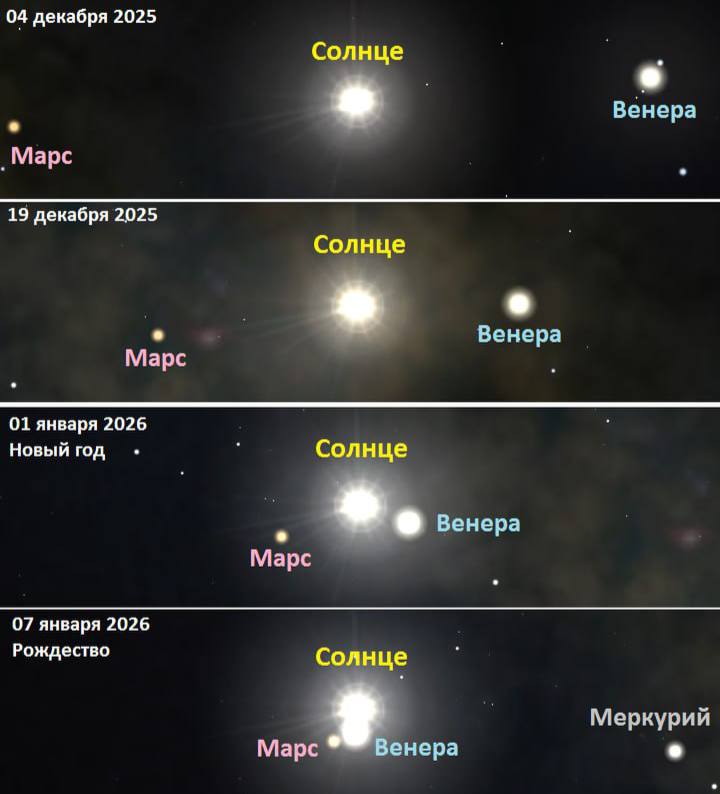 «Все три наблюдаемые с Земли планеты, ближайшие к Солнцу — Меркурий, Венера и Марс — сходятся в его окрестностях, впервые с осени 2019 года. К 19 декабря Венера и Марс сблизятся с Солнцем уже на 5-6 градусов. В канун Нового года их будет разделять уже около 2-3 градусов, а в канун Рождества (6 января) Солнце, Венера и Марс практически сольются на небе, образую своеобразную Вифлеемскую звезду.
