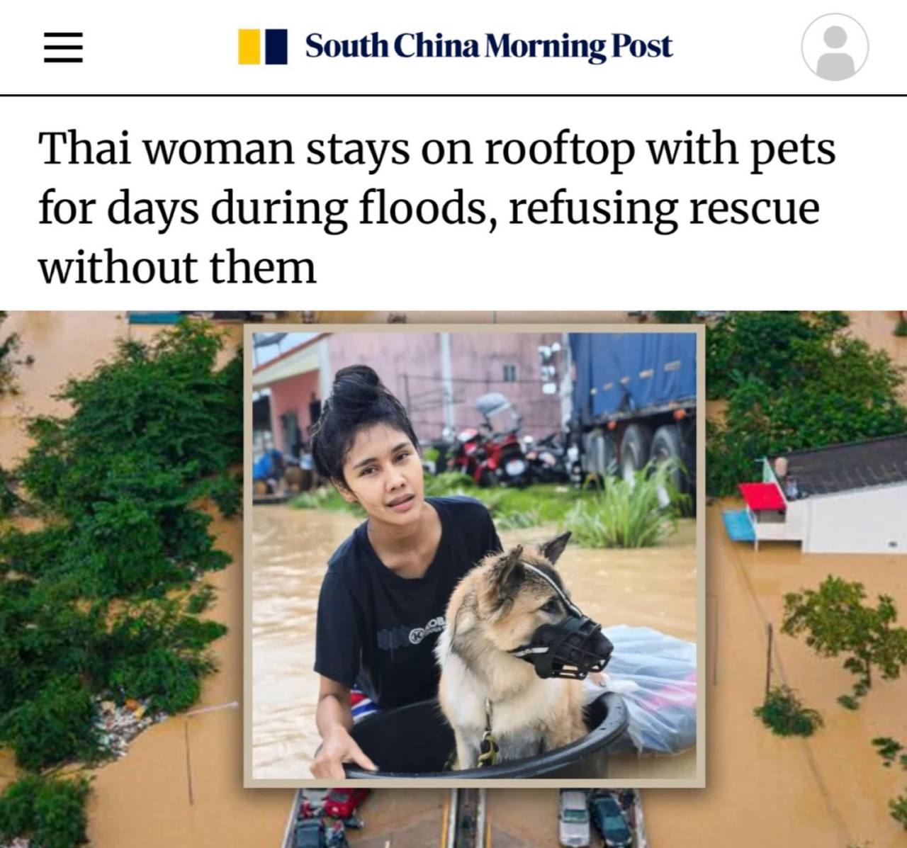 «Жительница Таиланда по имени Джаз стала героиней соцсетей после того, как отказалась покинуть крышу своего дома во время масштабных наводнений, чтобы остаться рядом с собакой и кошкой. Джаз обратилась за помощью через социальные сети, сообщив, что уровень воды вокруг ее дома стремительно поднимается. Она также указала свои координаты и попросила отключить электричество в районе, чтобы избежать возможного поражения током.