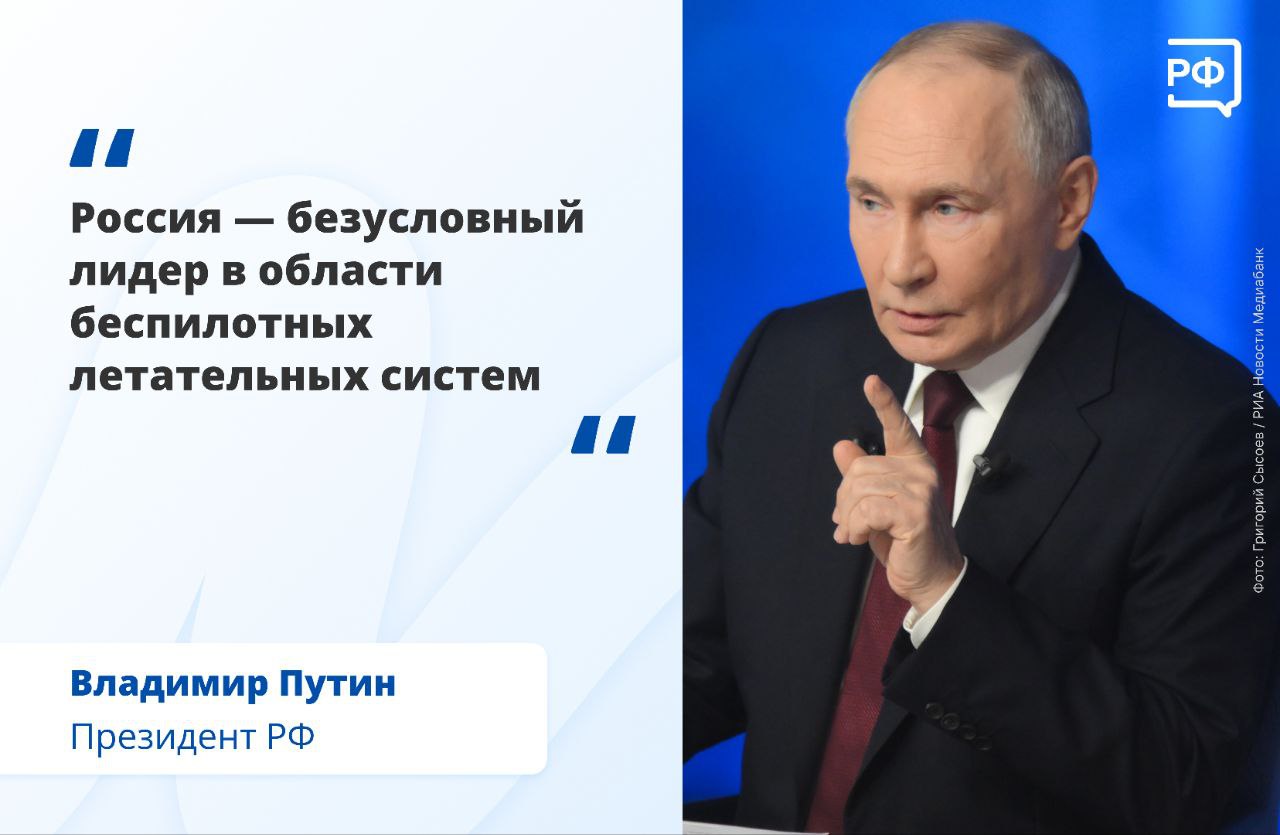 Глава государства также выразил благодарность россиянам, в том числе предпринимателей, которые собрали 83 млрд рублей на развитие беспилотных систем.