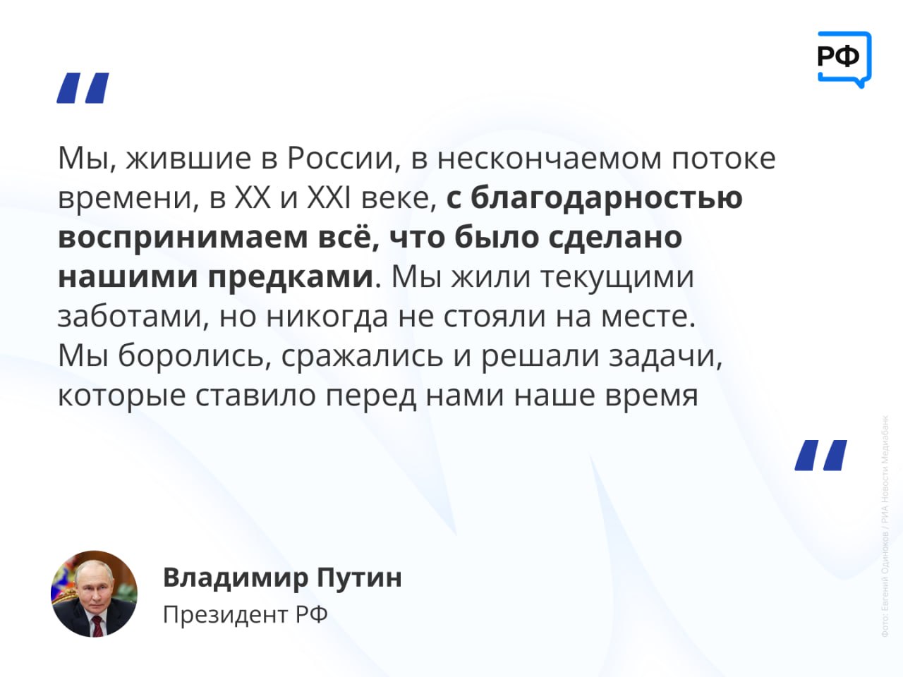Мы, жившие в России в нескончаемом потоке времени в XX и XXI веке, с благодарностью воспринимали всё, что было сделано нашими предшественниками, нашими предками.Мы жили как все, везде и всегда — нашими текущими заботами, но мы не стояли на месте. Мы шли вперёд, мы работали, боролись, сражались и наилучшим образом старались решать проблемы, которые ставило перед нами наше время. Мы думали о будущем, думали о вас.
