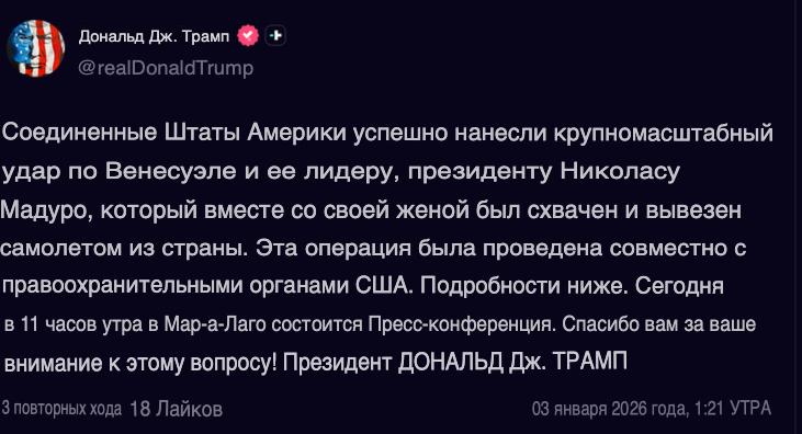 США успешно провели полномасштабный удар по Венесуэле, Мадуро вместе с женой был захвачен и вывезен из страны, написал Трамп.