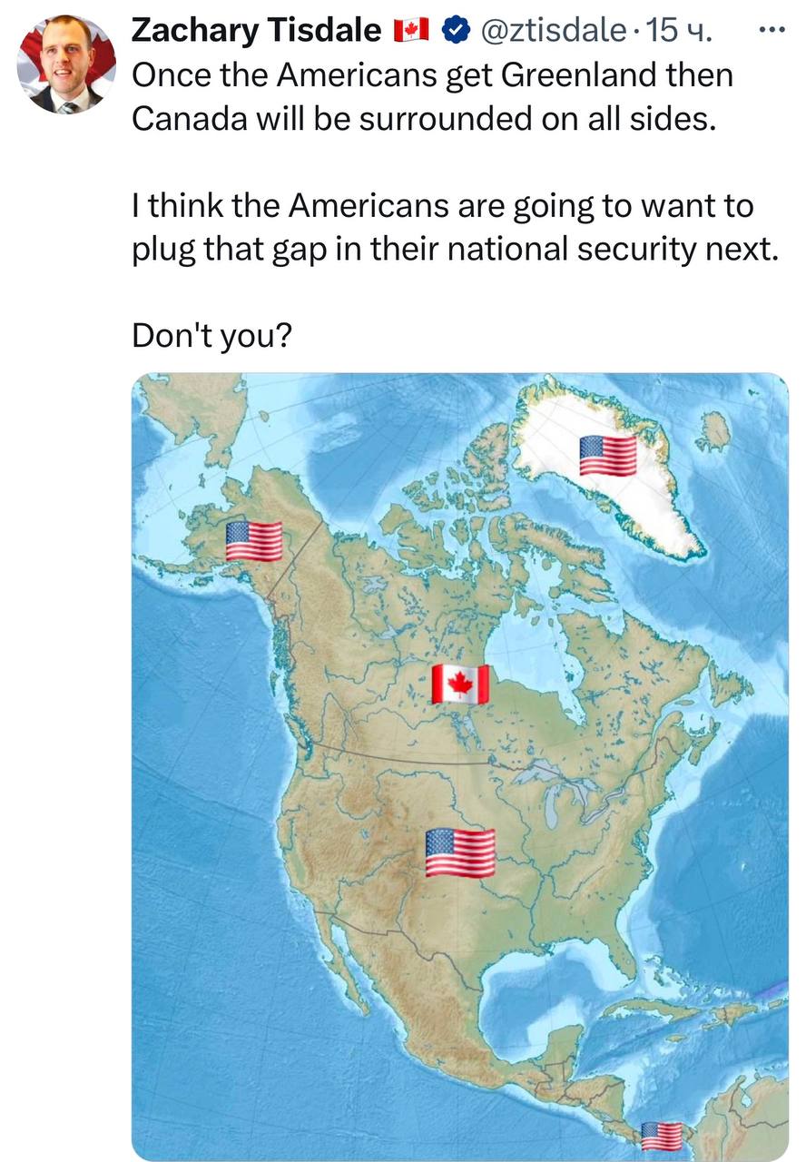 «Как только американцы захватят Гренландию, Канада окажется окружена со всех сторон. Думаю, в дальнейшем американцам захочется восполнить этот пробел в своей национальной безопасности. Разве не так?»